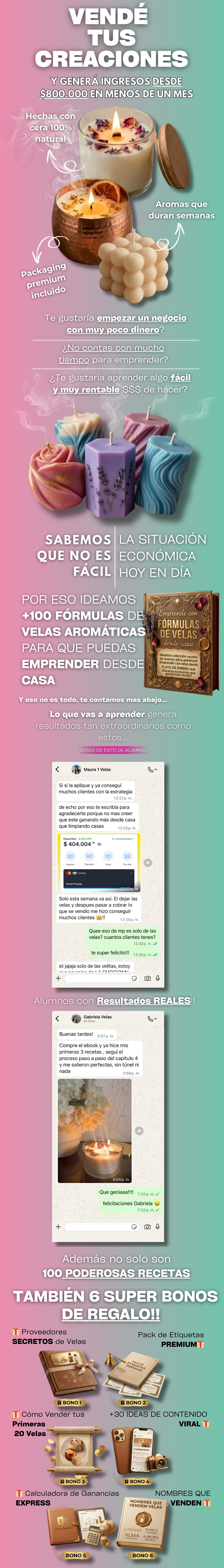 "Mi mejor fin de semana: 48 velas vendidas y $210.000 de ganancia limpia. Los posteos y flyers editables del curso me hicieron despegar en Instagram. Si querés emprender con velas aromáticas desde tu casa y apuntar a más de $800.000 por mes, este es el camino."